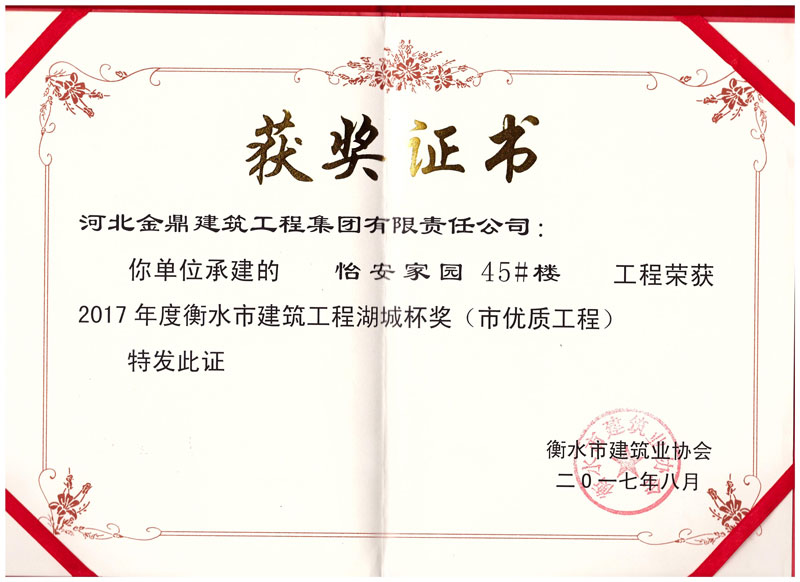 怡安家園45#樓工程榮獲2017年衡水市建筑工程湖城杯獎(市優(yōu)質(zhì)工程)