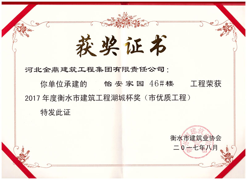 怡安家園46#樓工程榮獲2017年衡水市建筑工程湖城杯獎(市優(yōu)質(zhì)工程)